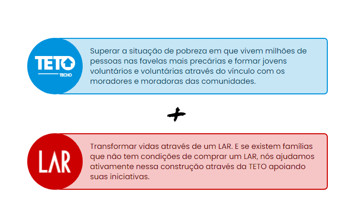 TETO atua há mais de 10 anos no Brasil e é associado a organização internacional TECHO, presente em 19 países da América Latina, para garantir a moradia nas favelas mais precárias e invisíveis do continente. No Brasil atua em seis estados e em BH a participação teve início em 2017 e no início de 2019 a LAR concretiza a parceria com a TETO e desde então segue junto com toda iniciativa.