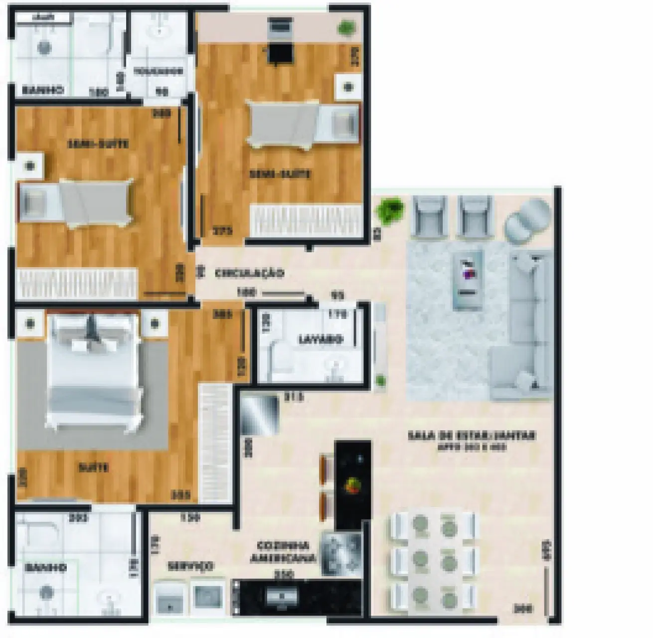 Área privativa: sala ampla para 2 ambientes com piso em porcelanato, 3 quartos com piso em laminado, sendo 1 suíte, banheiros com piso em porcelanato, bancada em granito, cozinha revestida com piso em porcelanato, bancada em granito, área externa com piso em porcelanato, área externa com piso em porcelanato anti-derrapante, espaço gourmet, 2 vagas de garagem.